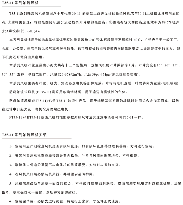 FT35-11和BT35-11型通风机的性能参数外形尺寸及其注意事项都可同T35-11一样。